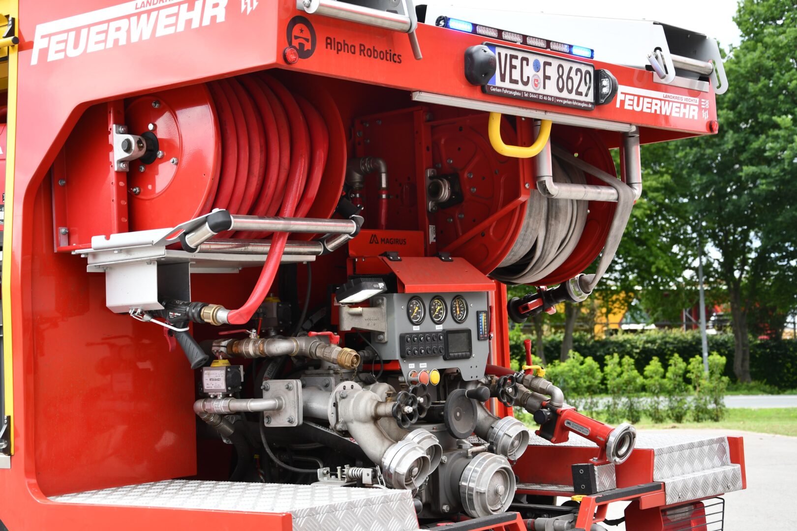 - Selbstschutzanlage mit elektrischer Pumpe als Redundanz sowie mit Düsen im Astabweiser an der Kabine und an den Reifen