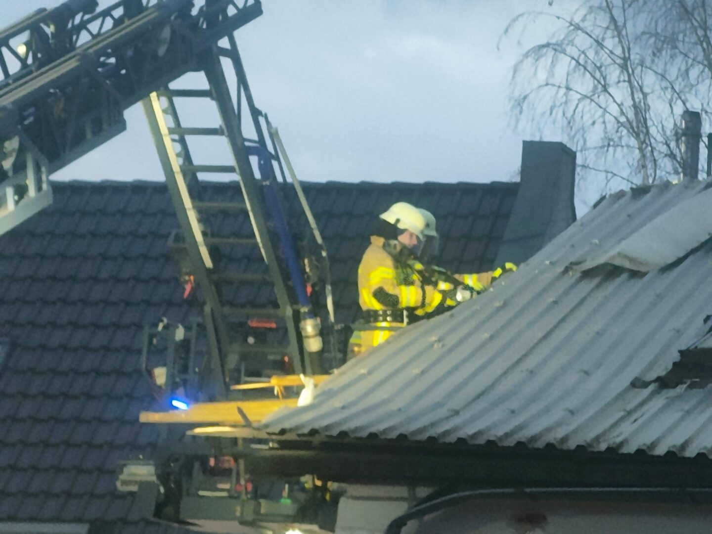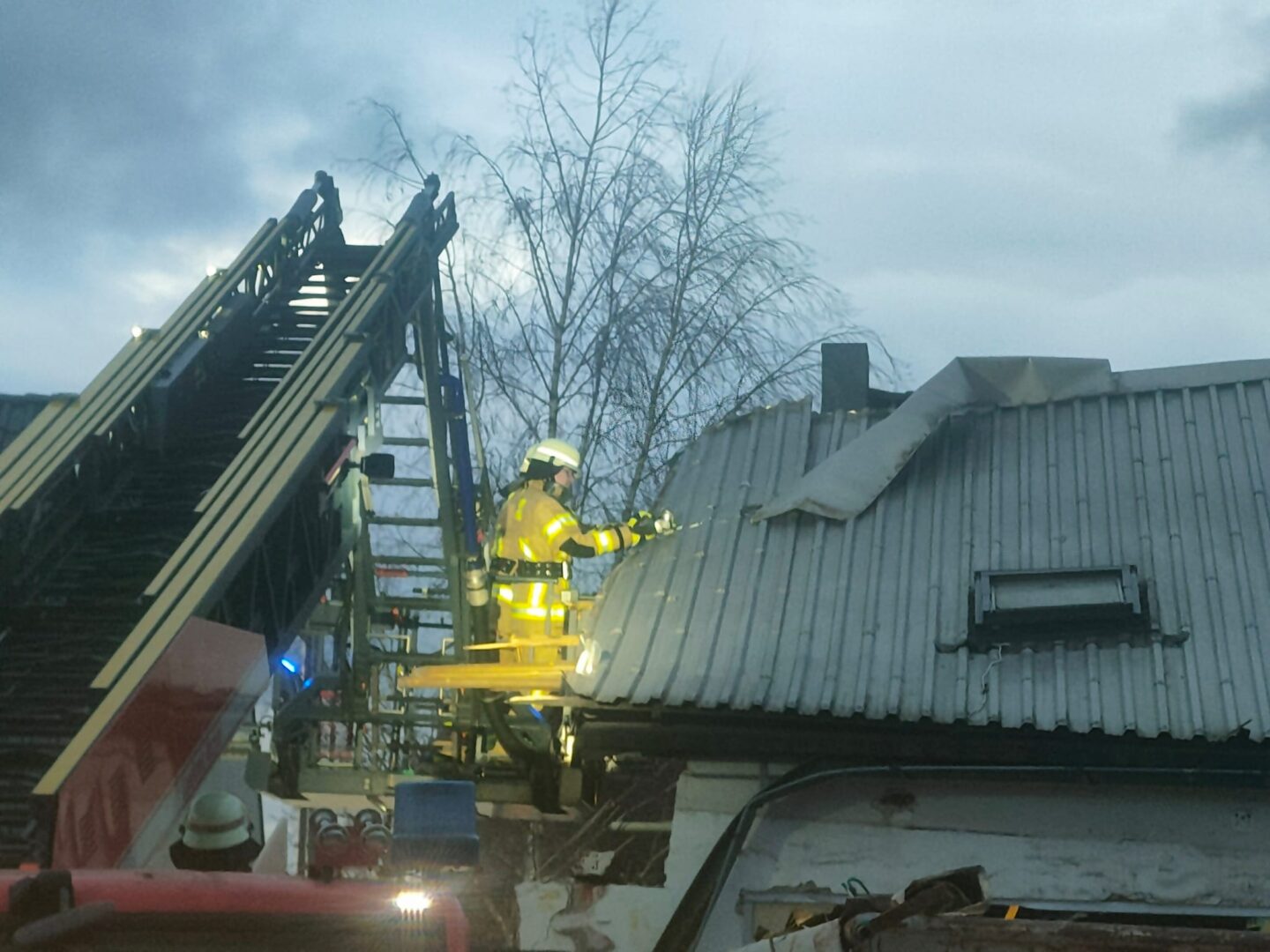 Unsere Einsatzkräfte entfernten und sicherten mittels Drehleiter die losen Teile des Gebäudes.