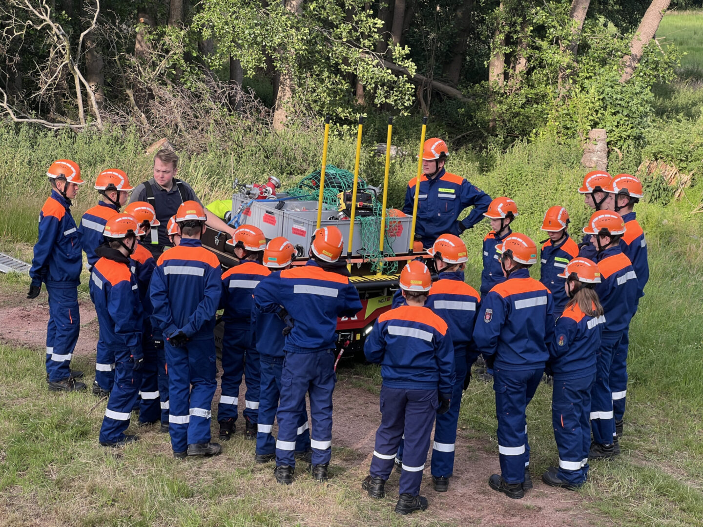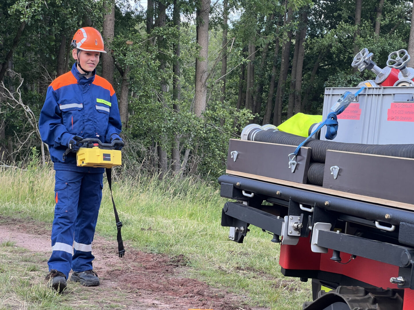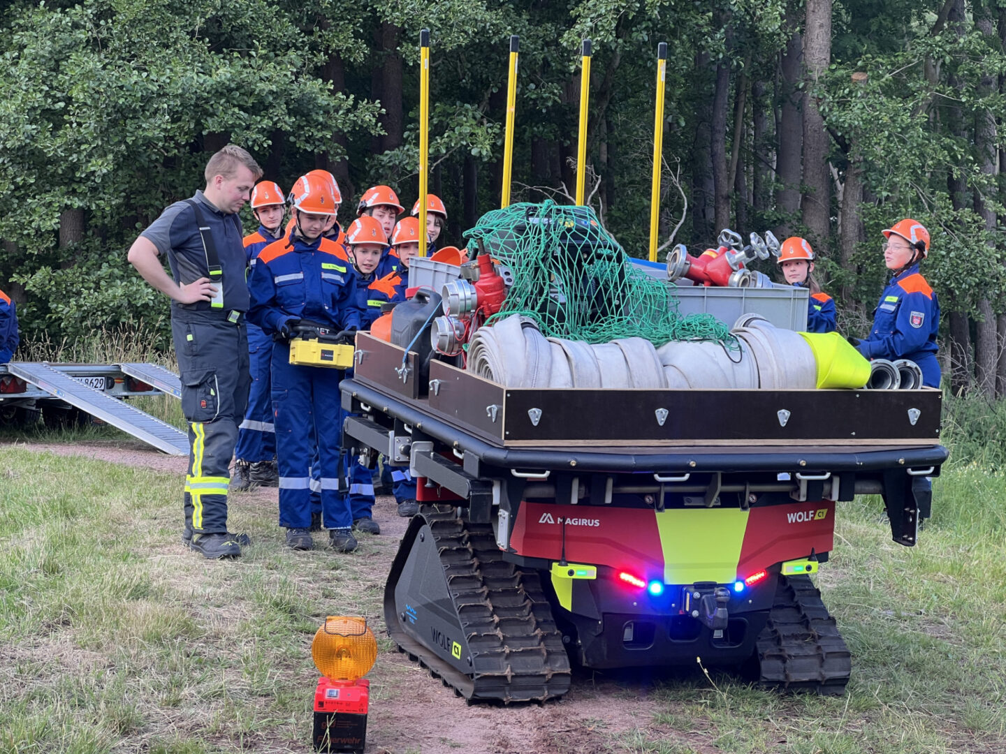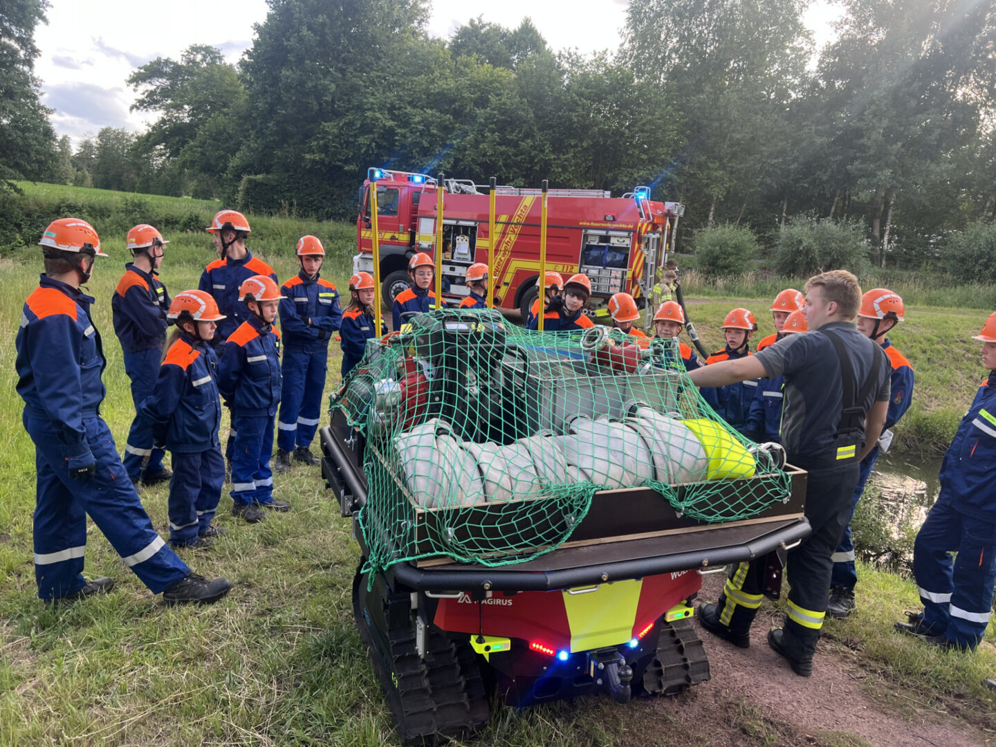 Nach einer kurzen Ansprache im Feuerwehrhaus machten sich die Jugendlichen gemeinsam mit unseren Löschfahrzeugen und dem „Alpha Wolf C1“ von Alpha Robotics auf den Weg ins Gewerbegebiet nach Calveslage. Am dortigen Regenrückhaltebecken wurde nicht nur Wasser aus dem offenen Gewässer angesaugt, sondern auch der taktische Einsatz sowie der sichere Umgang mit dem Wolf C1 vermittelt.