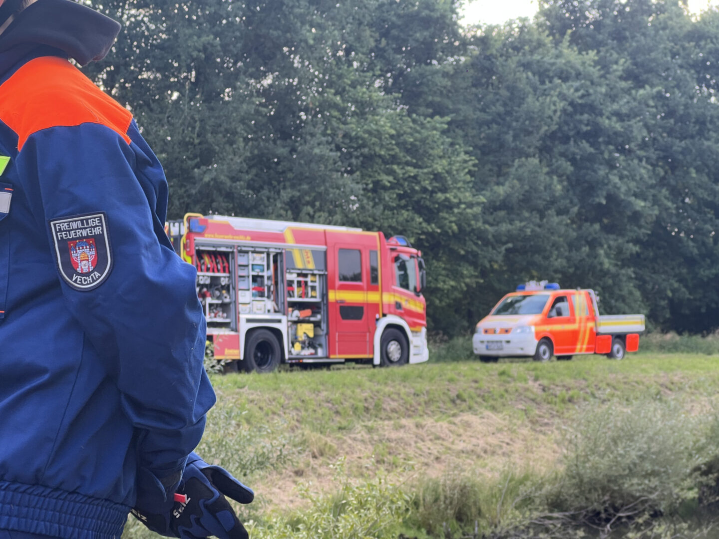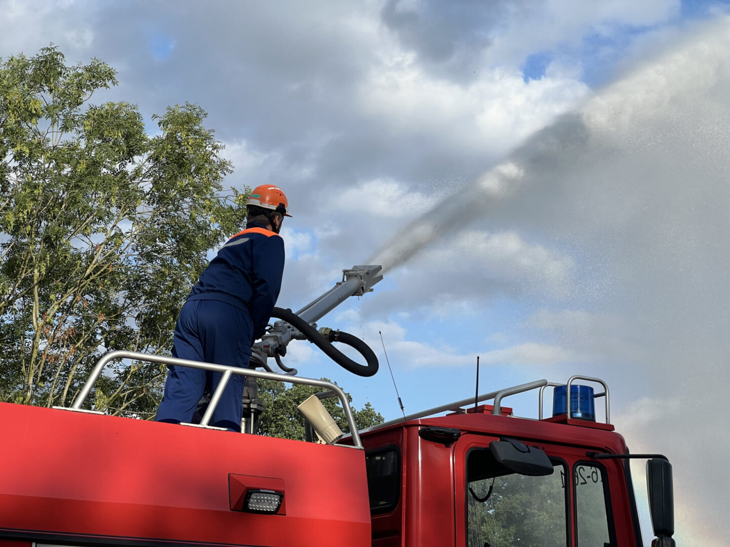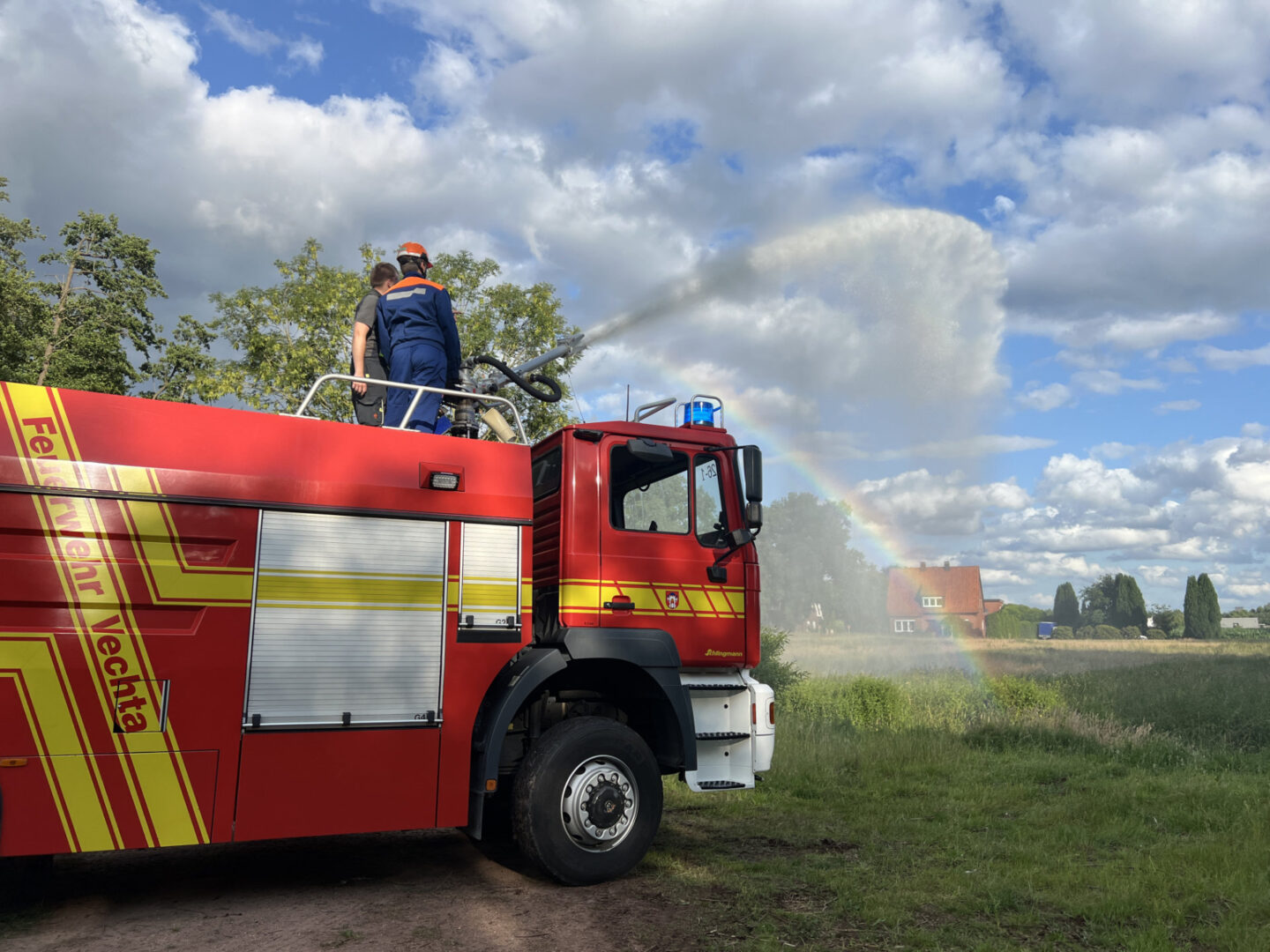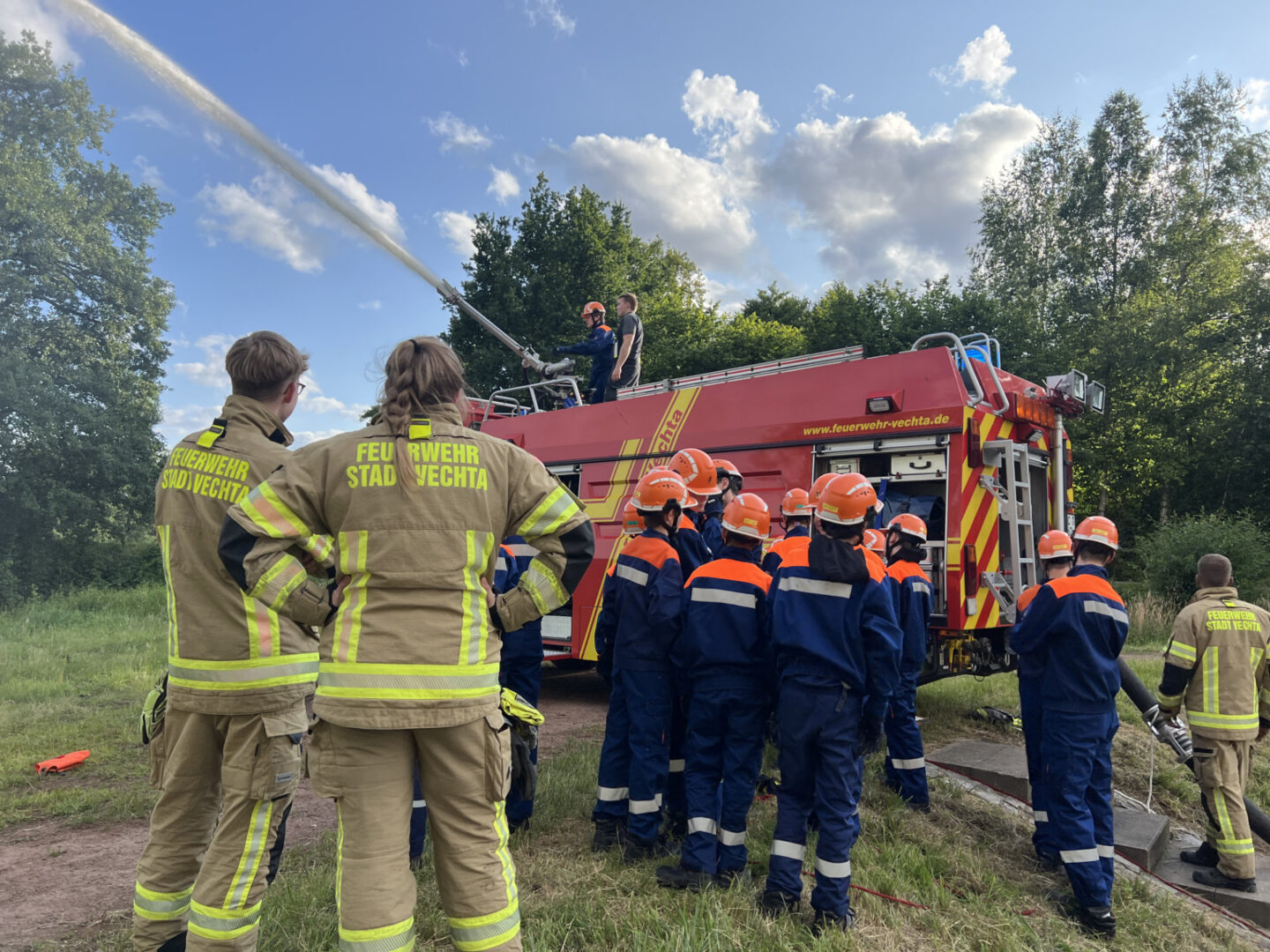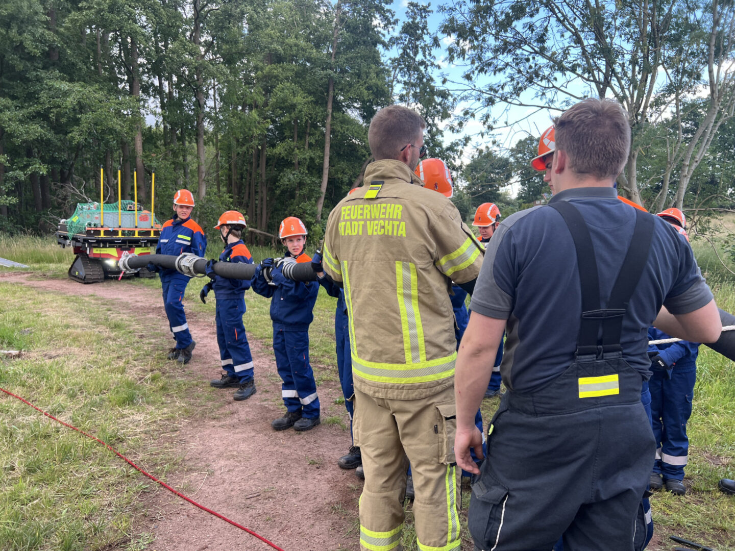 Nach einer kurzen Ansprache im Feuerwehrhaus machten sich die Jugendlichen gemeinsam mit unseren Löschfahrzeugen und dem „Alpha Wolf C1“ von Alpha Robotics auf den Weg ins Gewerbegebiet nach Calveslage. Am dortigen Regenrückhaltebecken wurde nicht nur Wasser aus dem offenen Gewässer angesaugt, sondern auch der taktische Einsatz sowie der sichere Umgang mit dem Wolf C1 vermittelt.
